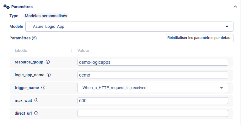 - max_wait : Maximum duration for tracking the Logic App on VTOM (synchronous), 0 with direct_url