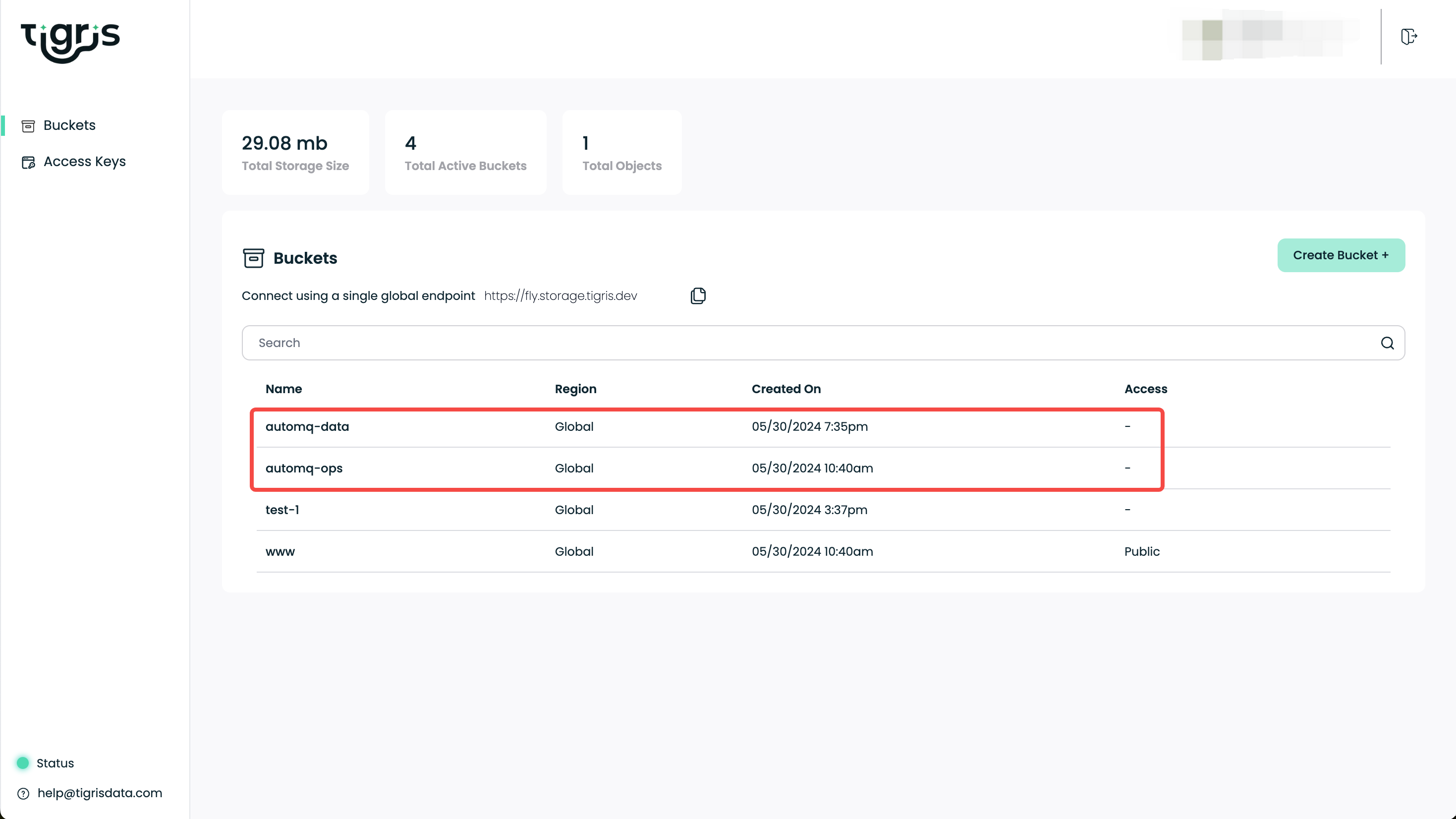 aws s3api create-bucket --bucket automq-data --endpoint=https://fly.storage.tigris.dev aws s3api create-bucket --bucket automq-ops --endpoint=https://fly.storage.tigris.dev