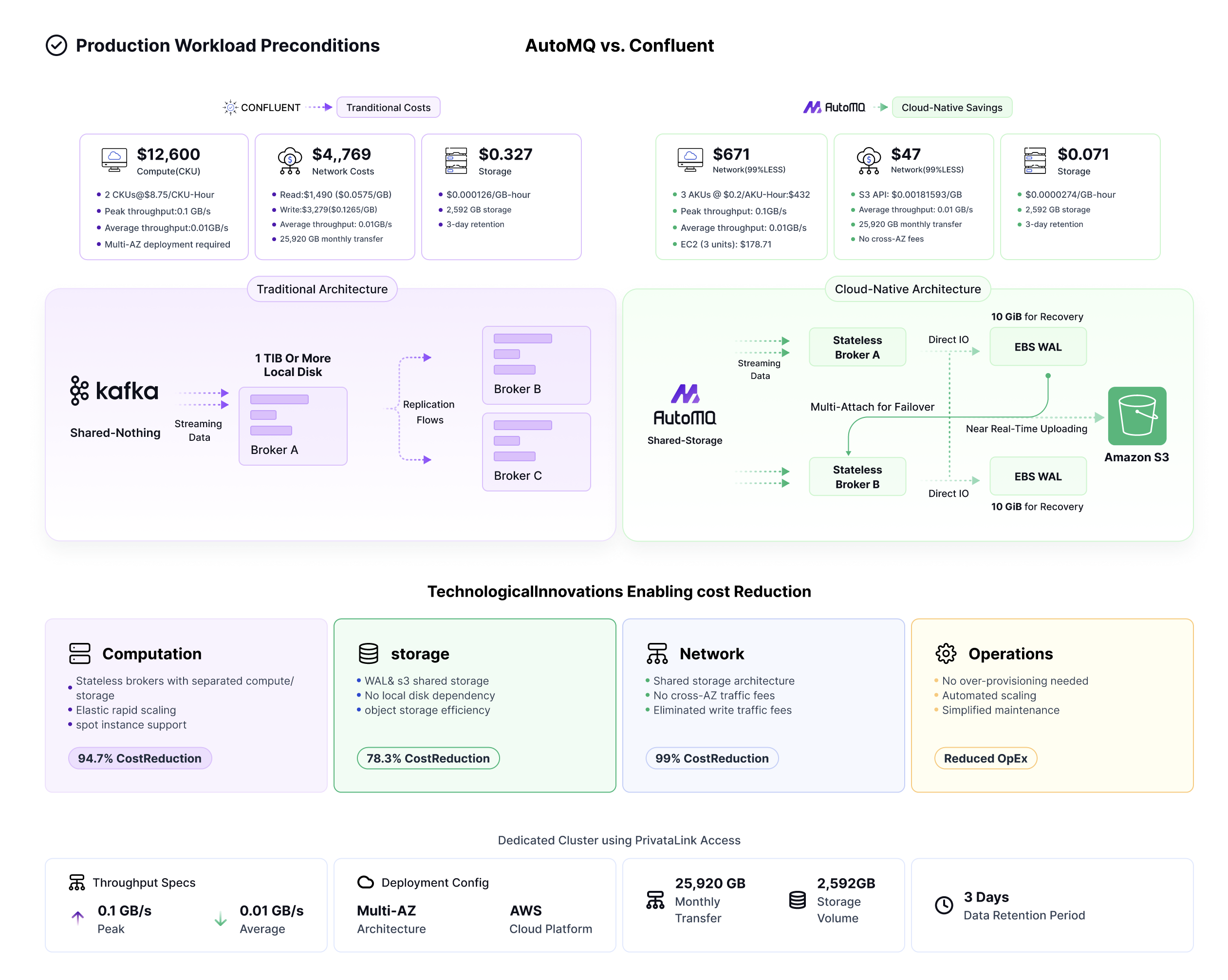The following diagram illustrates how AutoMQ leverages technical innovations to reduce costs by over 90% compared to Confluent, without any performance degradation, under typical production workloads. These technical innovations primarily include: