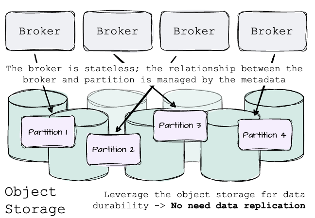 Because the object storage service guarantees data durability and availability, it is unnecessary to replicate data across brokers. Thus, every partition will have only one replica—the leader.