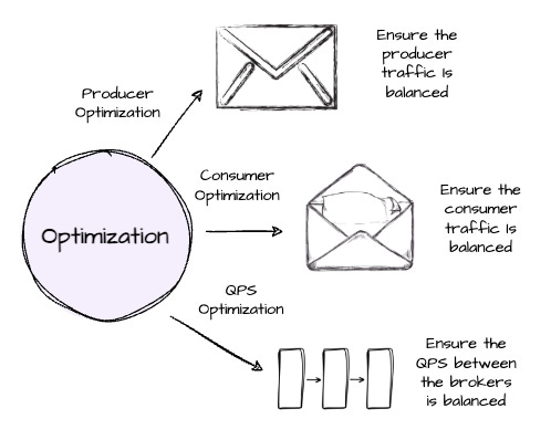 - The optimization type has goals like cluster traffic rebalancing. AutoMQ further categorizes the optimization goals into producer, consumer, and QPS (Query Per Second) balancing goals. Different types of balance goals address various metrics. For instance, the producer/consumer balance goal aims to ensure the producer/consumer traffic is balanced, or the QPS goal aims to balance the QPS between brokers.