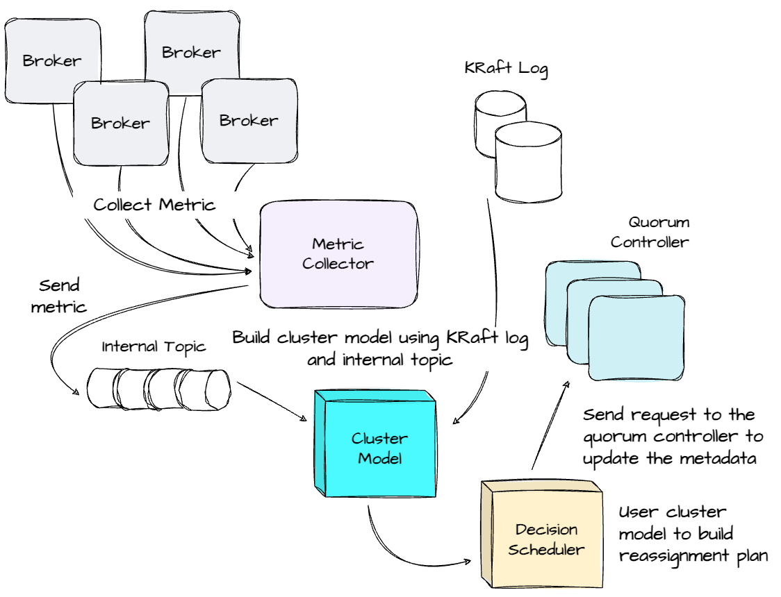 State Manager : On the controller, AutoMQ maintains a ClusterModel representing the cluster’s current state and partition loads. Changes to the cluster, such as broker additions, removals, or partition reassignments and deletions, are managed by monitoring KRaft metadata to update the ClusterModel. Meanwhile, the controller continuously consumes from the internal topic, preprocesses the extracted metrics, and updates the ClusterModel, ensuring it accurately reflects the cluster's current state.