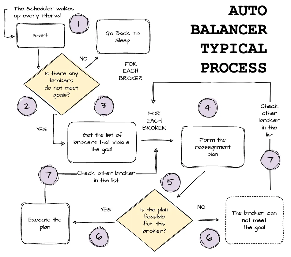 The self-balancing scheduler process kicks off every interval (e.g., every 60 seconds) to check if the cluster meets all the goals. If yes, the scheduler goes back to sleep.