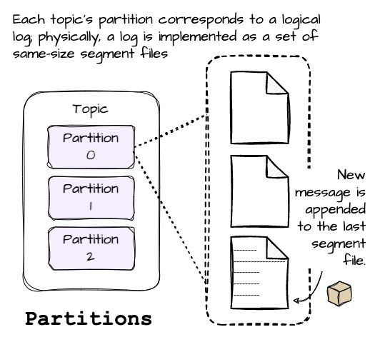 Each partition of a topic corresponds to a logical log. Physically, a log is implemented as a set of segment files of approximately the same size (e.g., 1GB). Whenever a message is written to the partition, the broker appends that message to the last segment file.