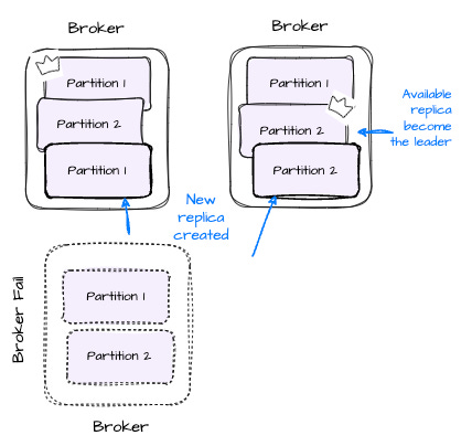 - If a broker fails, Kafka will automatically reassign leadership of any partitions for which this partition was the leader to other brokers that hold replicas. Kafka may eventually create new replicas of these partitions on other available brokers to maintain the replication factor.