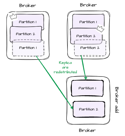 - When a broker is added, the replicas are redistributed to ensure an even workload between brokers.