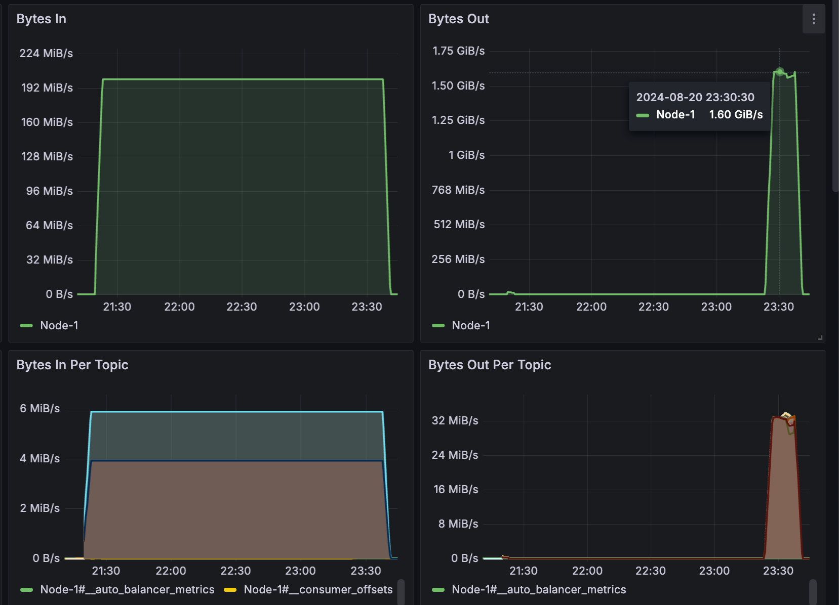 The peak catch-up consumption rate was 1.6 GB/s, with each Topic maintaining a consumption rate of 32 MB/s. It took a total of 18 minutes to consume 1.37 TB of backlog data.