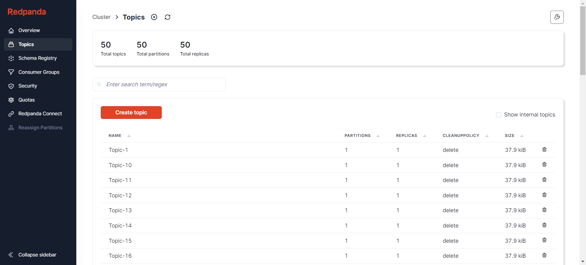 After creation, you can use various visualization tools to check the Kafka node status, such as Redpanda Console [9] and Kafdrop [10]. Here, using Redpanda Console as an example, you can see there are already 50 Topics, and each Topic has 500 initial messages.