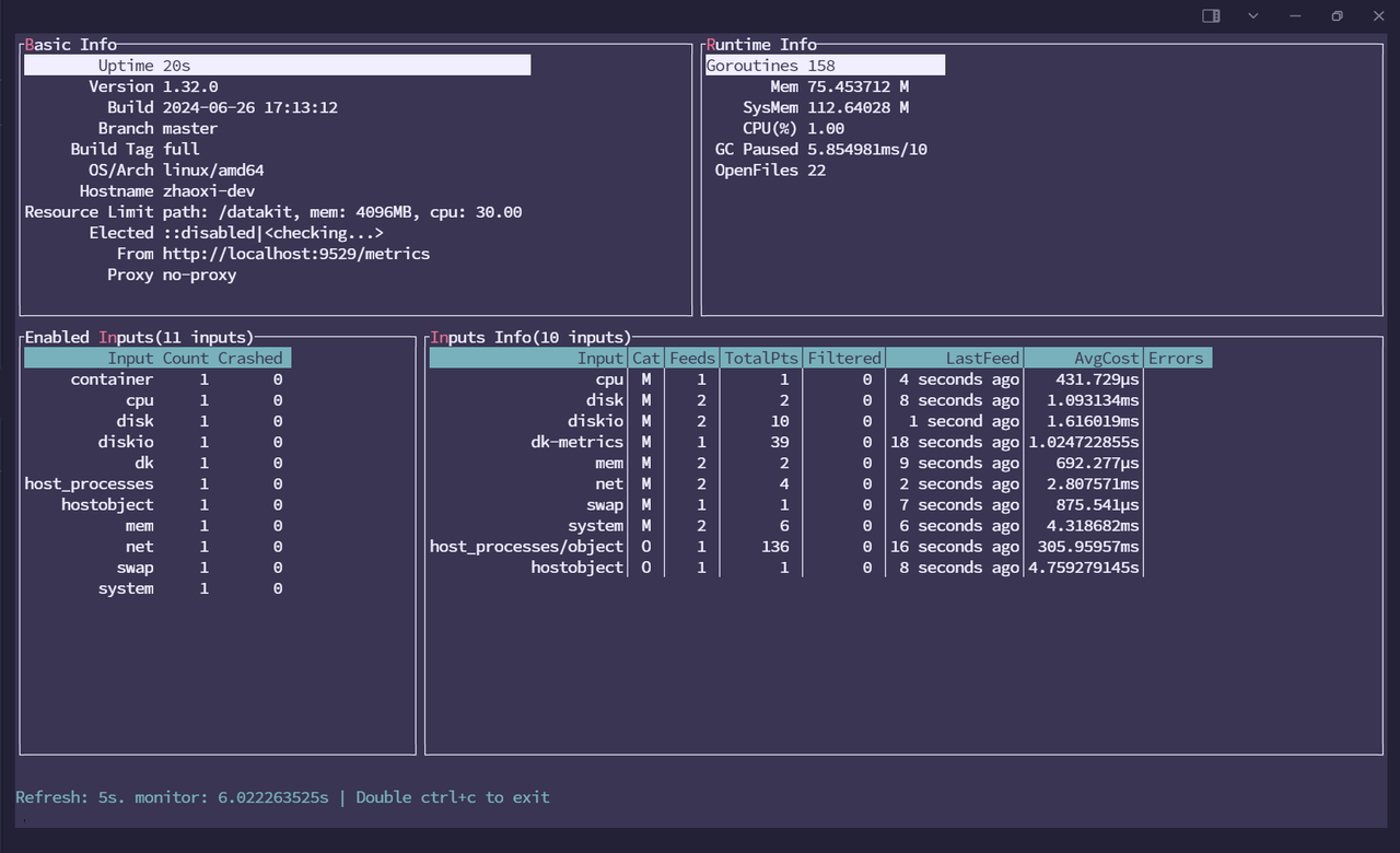 After successfully executing the installation command, use the command `datakit monitor` to verify whether DataKit was installed successfully.