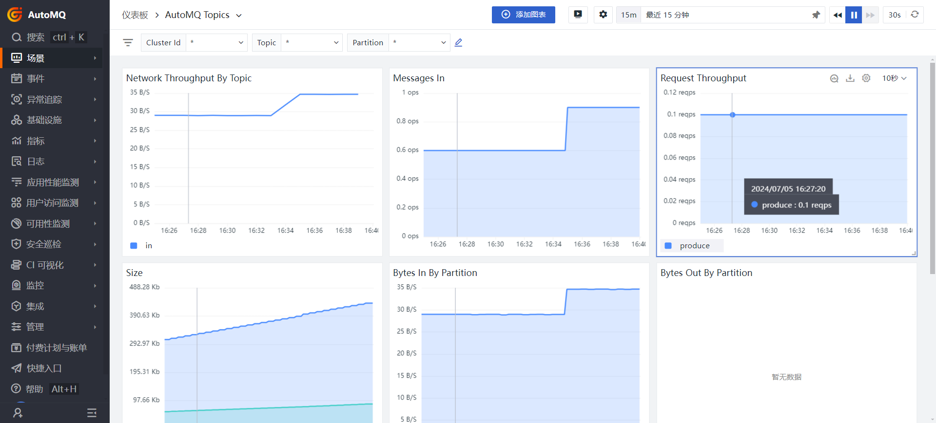 The Observation Cloud platform has integrated AutoMQ and offers multiple default dashboards. You can view them at Dashboard Example [7]. Below are some commonly used templates, with a brief introduction to their functionalities: