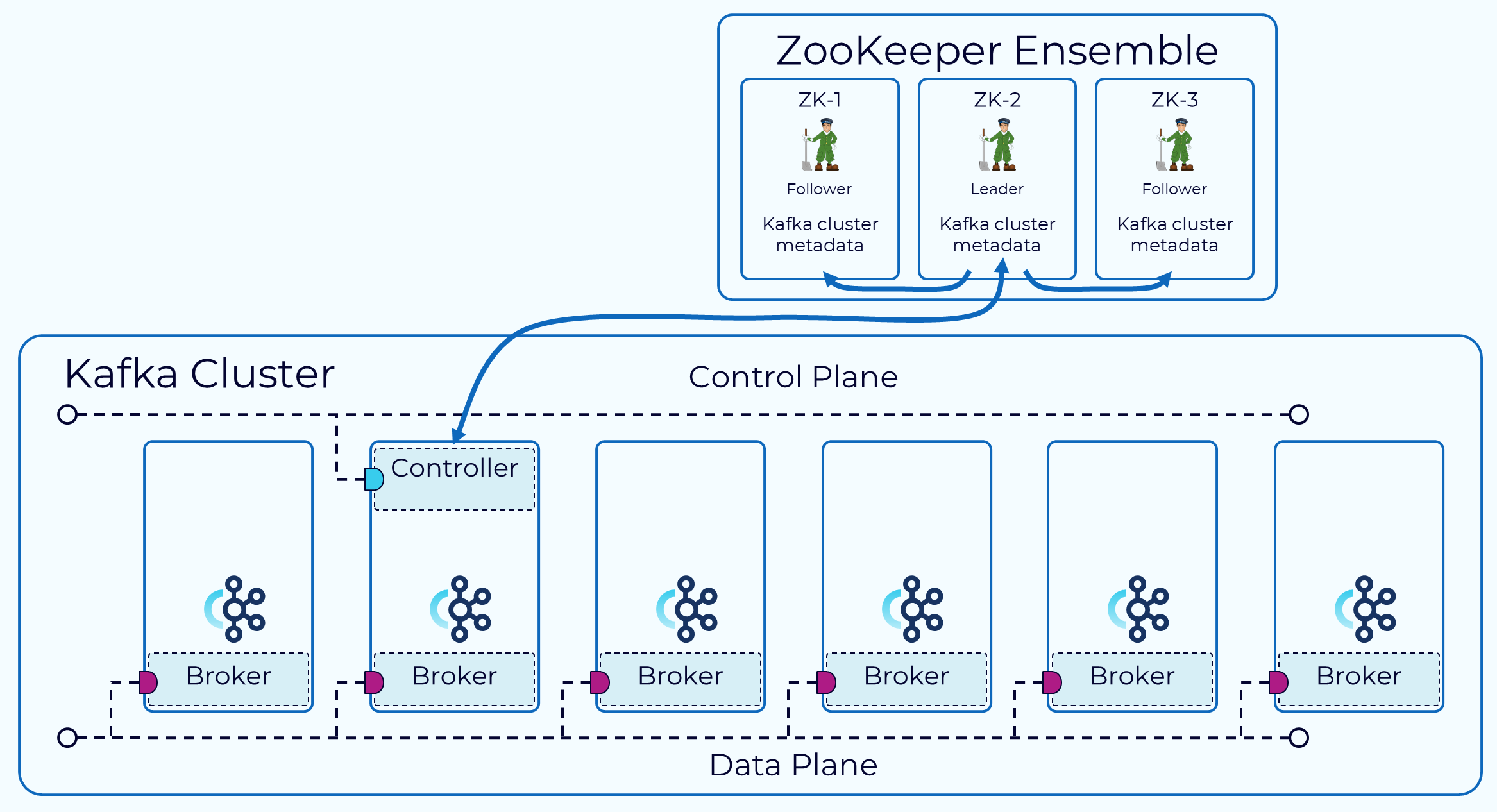 ZooKeeper plays several vital roles in the traditional Kafka architecture, serving as the backbone for cluster management and coordination. The controller broker in a Kafka cluster is responsible for communicating with ZooKeeper and relaying relevant information to other brokers[8]. This hierarchical relationship ensures efficient metadata management and cluster coordination.