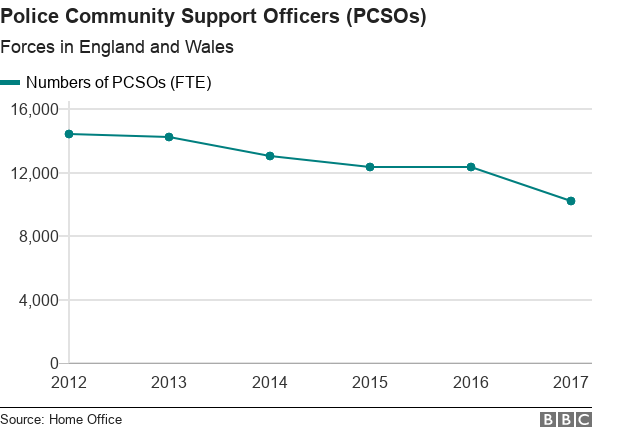 - Line chart: Changes in numbers of Police Community Support Officers (PCSOs) in England and Wales 2012-17