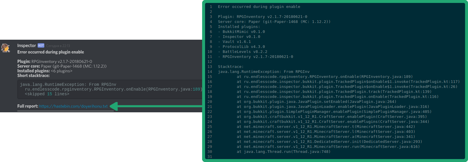 NOTE: Inspector filters all tracked exceptions from console to not bother server owners. All plugin-related logs will be saved to log file in the plugin folder.