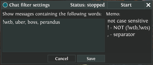 Set up words to look for (or not!) in chat. Extremely useful for when buying something specific from chat, looking for Trials, specific challenged and other things you might be interested in. Works in conjunction with the notification panel.