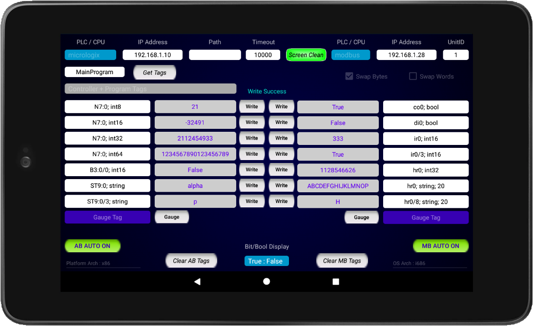 Android tablet app for communication with Allen Bradley and/or Modbus programmable logic controllers (PLC) via WiFi on a local network.