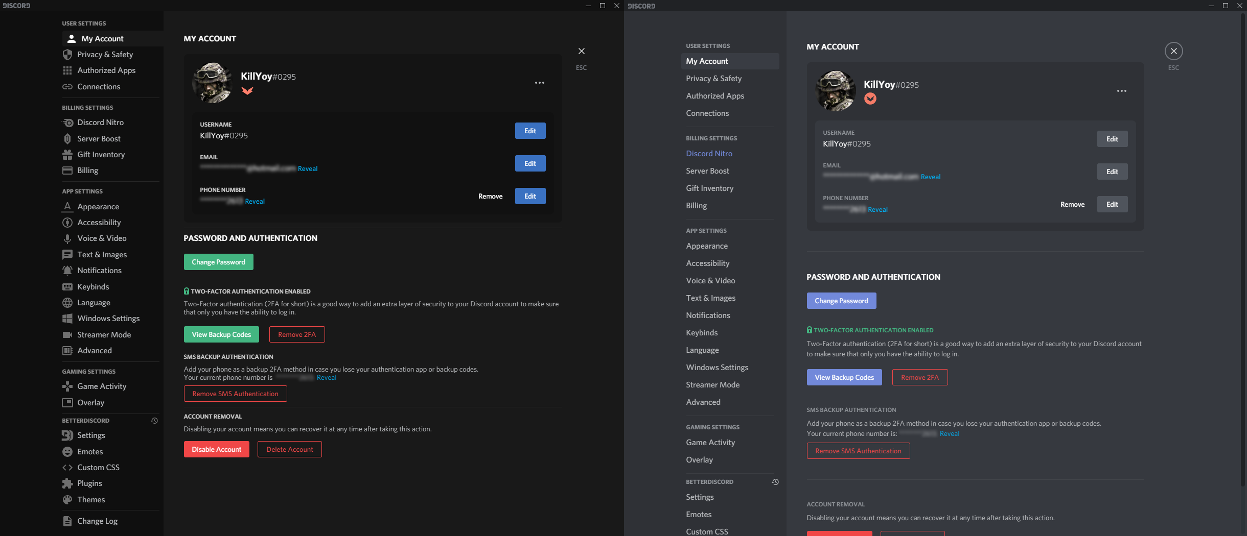 A comparison with and without the theme enabled in BetterDiscord (Images are slightly outdated)