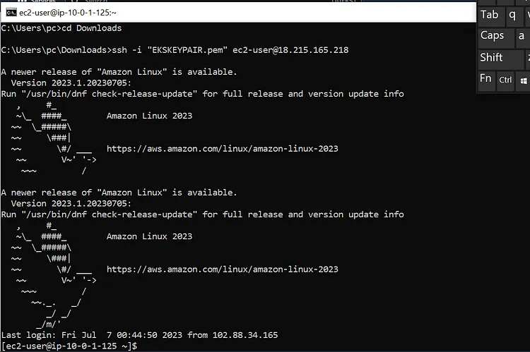 Now head to your cmd line on your machine and cd into the directory where your Keypair(.pem) is stored. In my case, it's stored in the Downloads directory. Yours could be different so take note. Once you are in the directory where your Keypair is stored paste in the ssh line you copied and press enter
