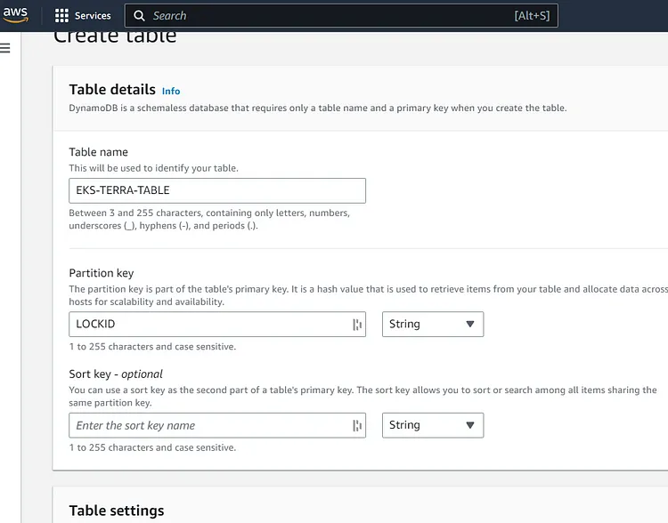 You can choose any name for your DynamoDB Table but it is important to note that the partition key is case sensitive. I named the Partition Key LOCKID because this will enable Dynamo DB to lock and release the file. Scroll down the page and click on Create Table