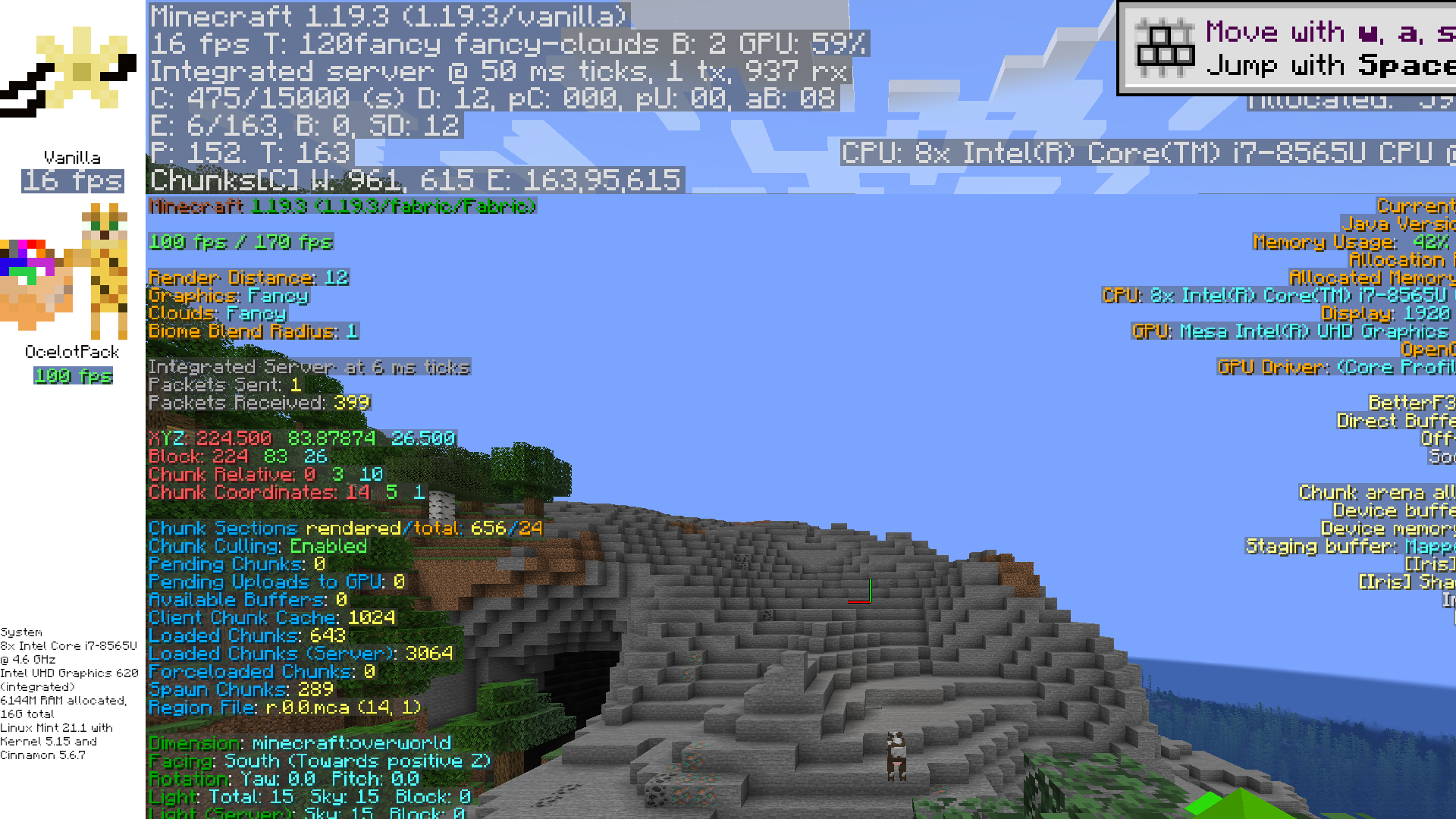 6.25x (100 with modpack, 16 vanilla) more FPS on Intel UHD Graphics 620/Intel Core i7-8565U, 6G RAM allocated and default settings on both packs, except that V-Sync is disabled.