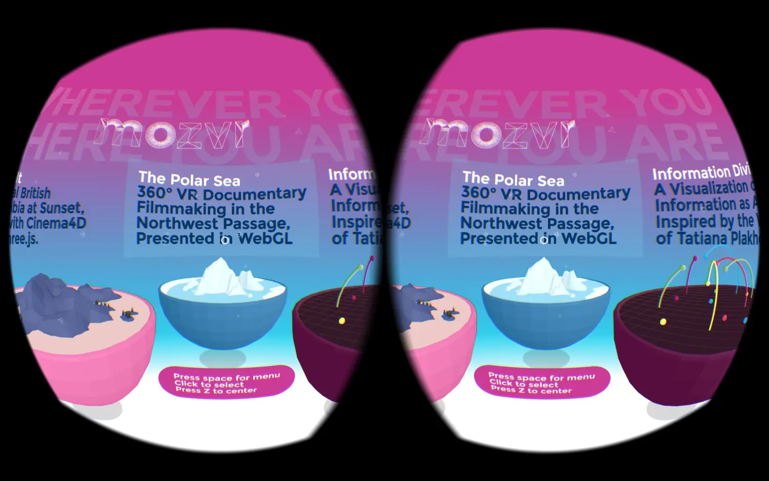 responisve WebVR: 探讨WebVR在不同头显(HMD)的适配方案 MolizaVR example: 火狐WebVR示例 webvr-boilerplate: A starting point for web-based VR experiences that work on all VR headsets. how to build webvr: How to Build VR on the Web Today