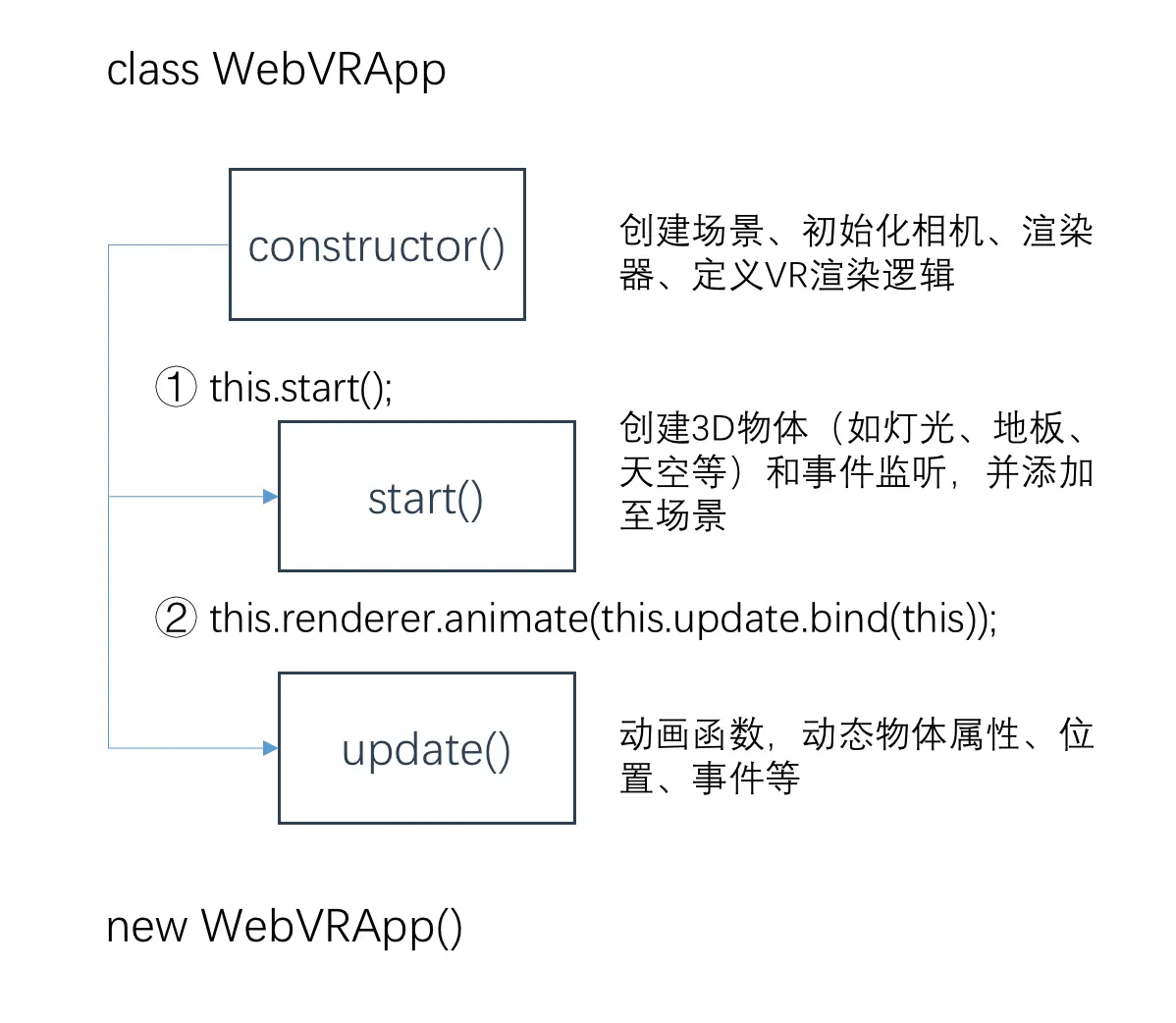 最后,将WebVR应用写成ES6 class,后面开发流程将按如下图结构来规范代码: