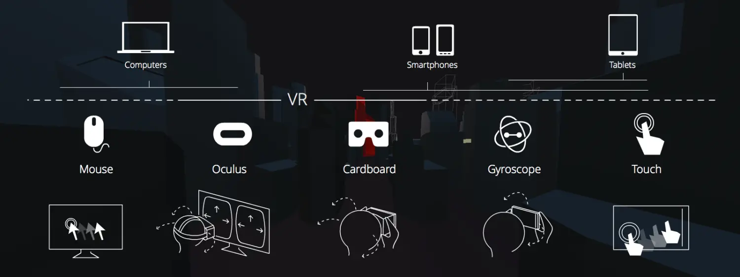 如使用cardboard眼镜来体验手机浏览器的webVR网页,浏览器将根据水平陀螺仪的参数来获取用户的头部倾斜和转动的朝向,并告知页面需要渲染哪一个朝向的场景。
