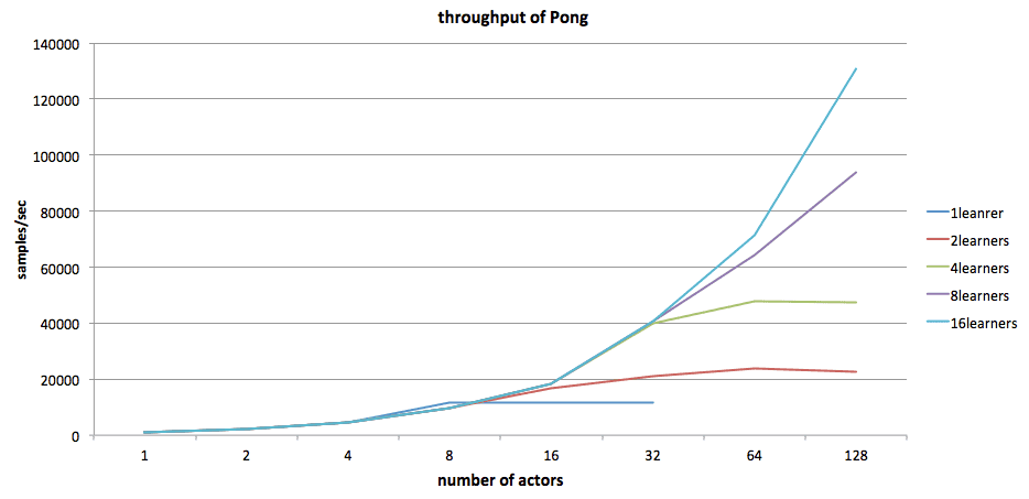 First, we study, how the throughput changes along the number of actors increases. As you can see from the following figure, once there are sufficient learners to consume the training samples without blocking the actors (i.e., the blue line corresponding to 16 learners), the throughput is almost linearly proportional to the number of actors.