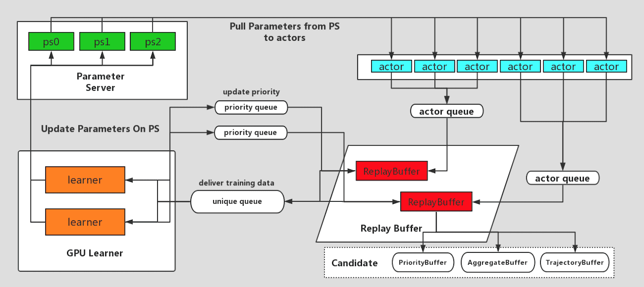 - Actor: periodically pull the latest model parameters, interact with its environment(s), and push the generated trajectories to buffer processes.