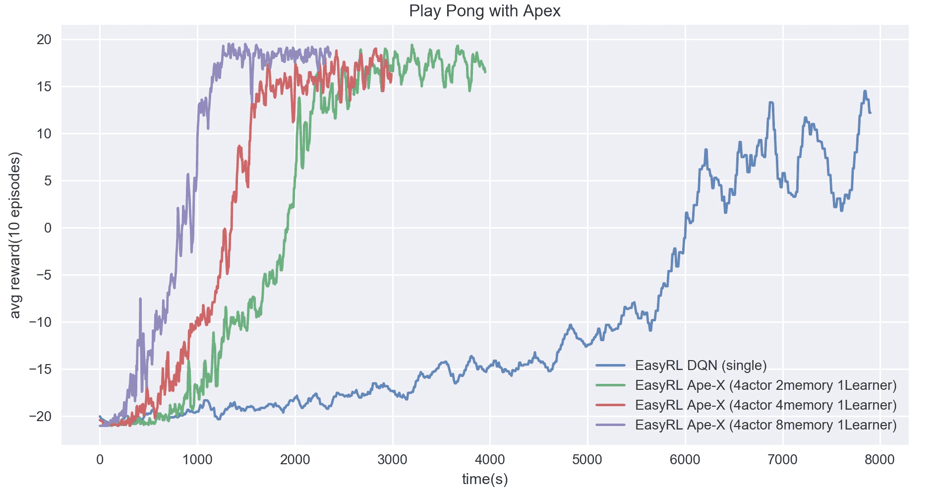We empirically evaluate the performance of EasyRL. Our experiment focuses on the throughput and the convergence rate of our Impala and ApeX implementations. We consider Pong as our environment and preprocesses each observation into an array with shape (42, 42, 4).