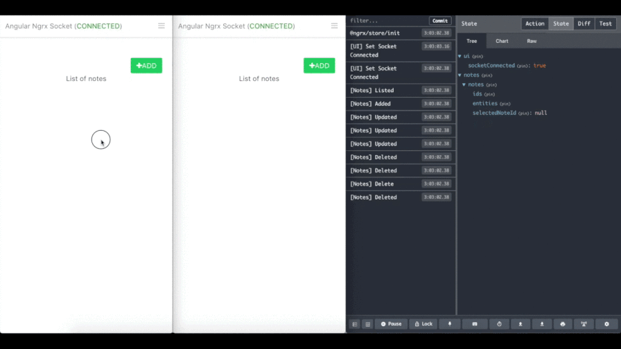 This Angular project demonstrates the implementation of a simple real time Notes app, with Socket.IO's asynchrnous 2-way event streams, combined with Ngrx/Store library for single state management à la Redux, and Ngrx/Effects to mange the side effects.