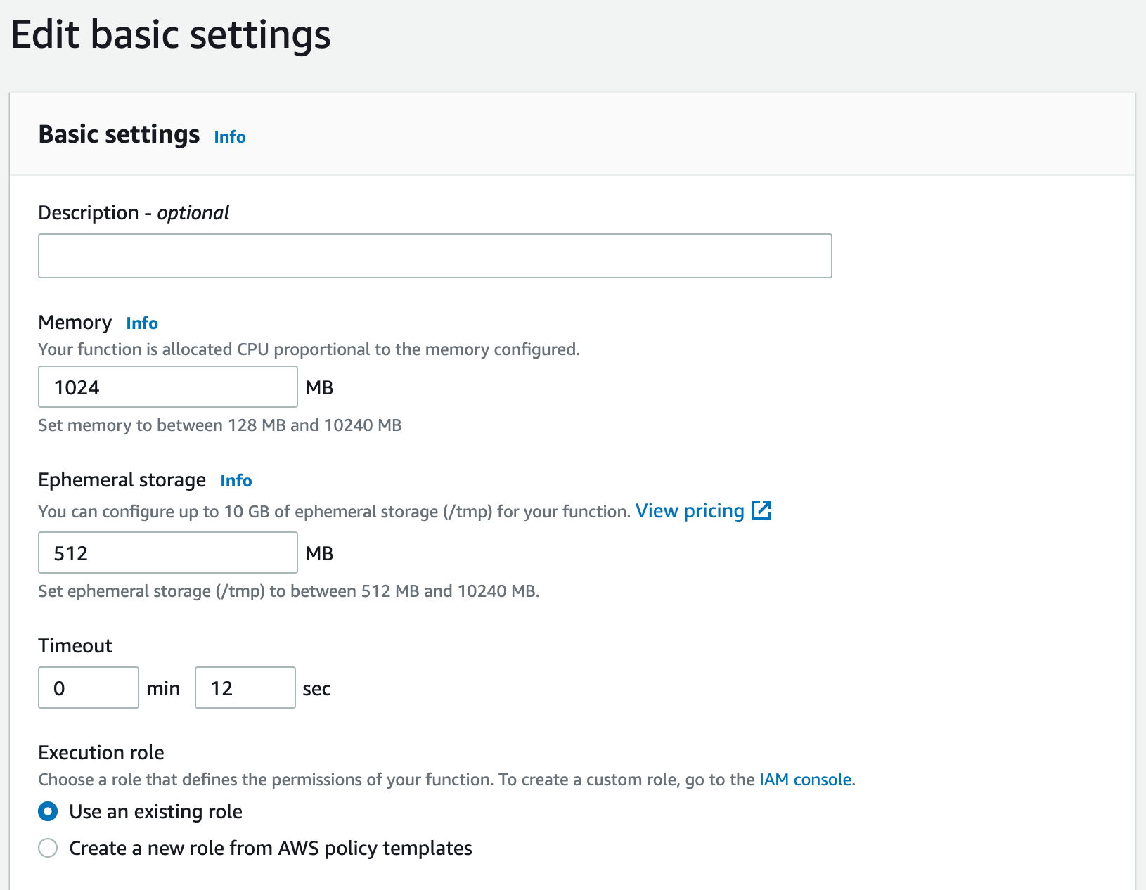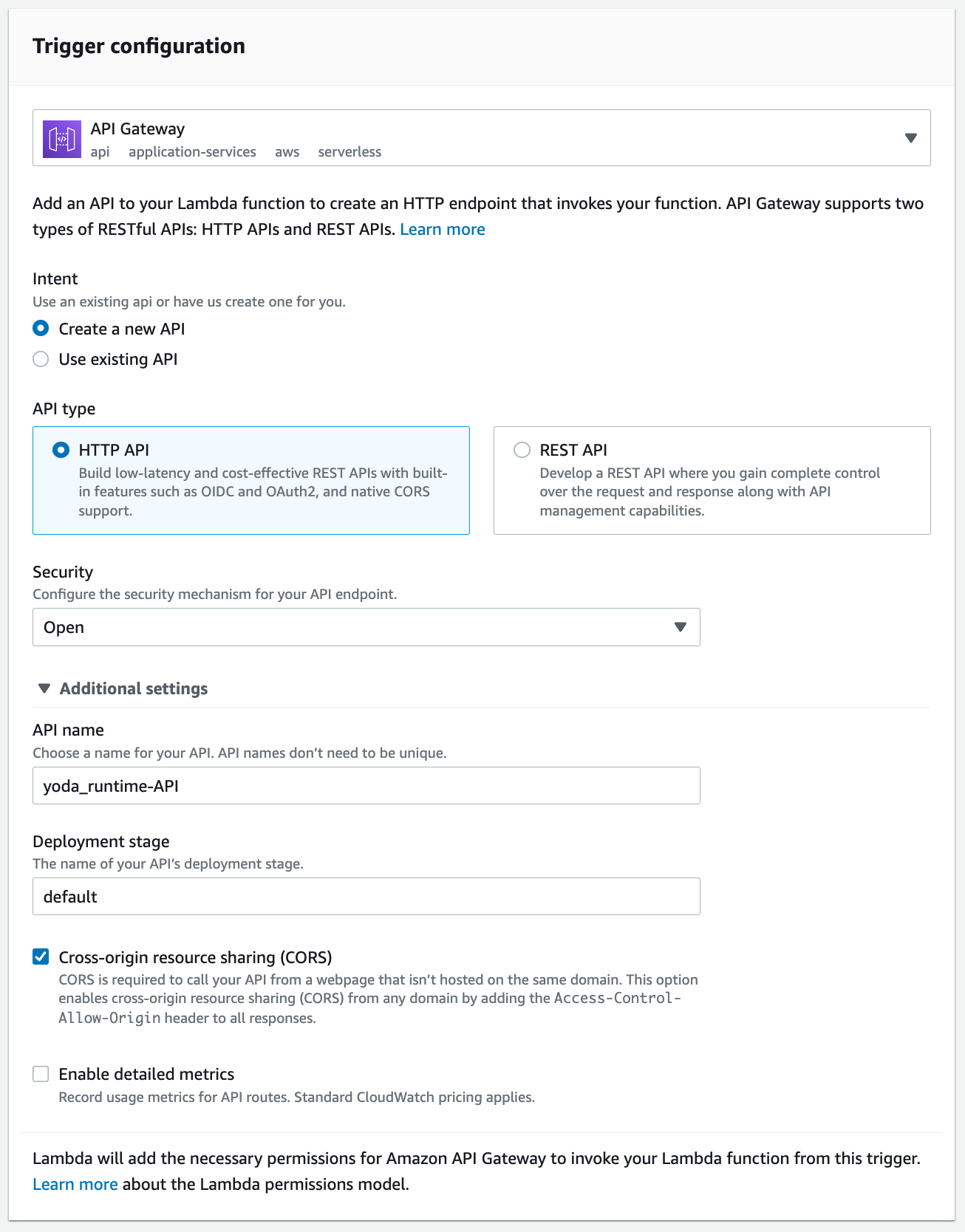 - For permission, if you don't have an existing role, create a new one. We recommend using the role with basic Lambda permission to make sure Yoda executor has no significant privileges.