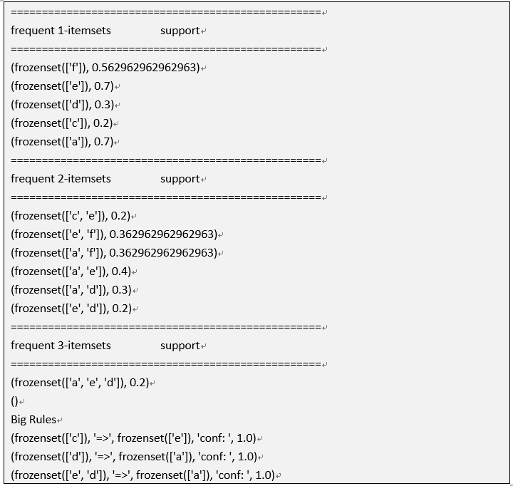 使用经典的Apriori算法,依次扫描交易记录集,计算出 k-候选集Ck 然后去除支持度sup小的项集获得 k-频繁集Lk, 只计算到 3-频繁集 ,最后计算管理规则可信度即可。