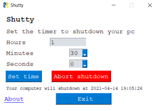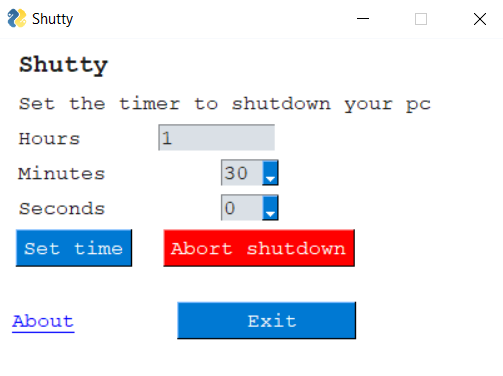 Shutty is a shutdown timer for your Windows PC, you just set the hours, minutes and seconds, and your computer will shutdown in that time