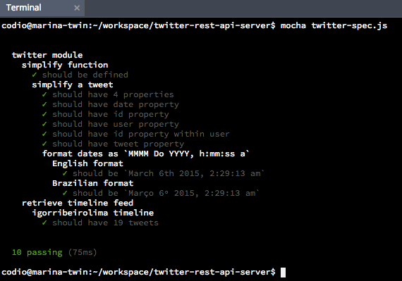 . It will support us on running our tests just typing mocha twitter-spec.js