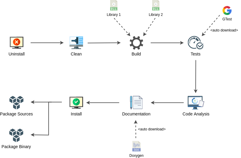 In this template project, we define a Build Lifecycle as a sequence of build phases that can be invoked to cover all the expected steps of a C++ project building and distribution process (just like Maven for Java). A build phase is a virtual set of cmake targets or cmake commands that can be executed to build a binary, build tests, generate the doc, build package, install or uninstall a project, etc.