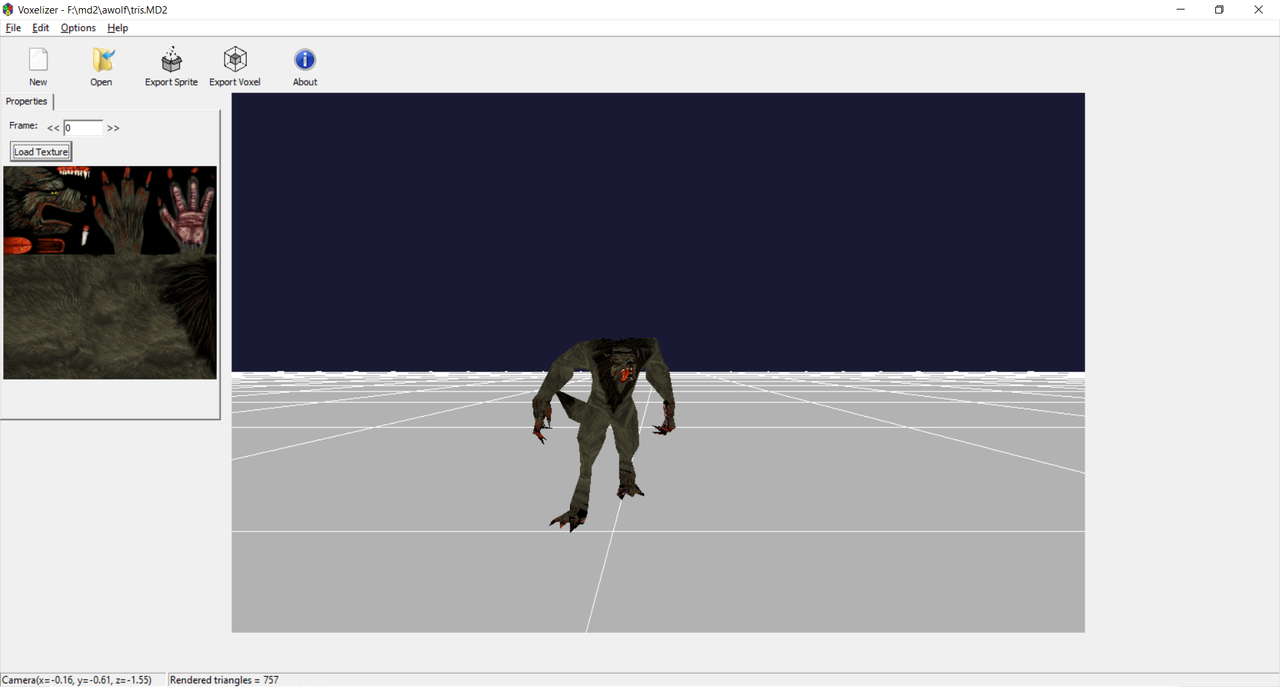 Voxelizer Features Export md2 models as voxels (sLab6's vox and DelphiDoom's ddvox formats) Export md2 models as Doom sprites Downloads version 1.0.4.32 (20211203 - win32) version 1.0.3.31 (20211117 - win32) version 1.0.2.29 (20210427 - win32) version 1.0.1.28 (20210427 - win32) Screenshots