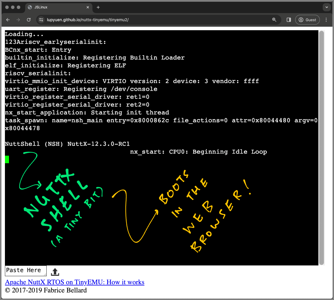 Can we boot NuttX in a Web Browser, with a little help from TinyEMU? Let's find out!