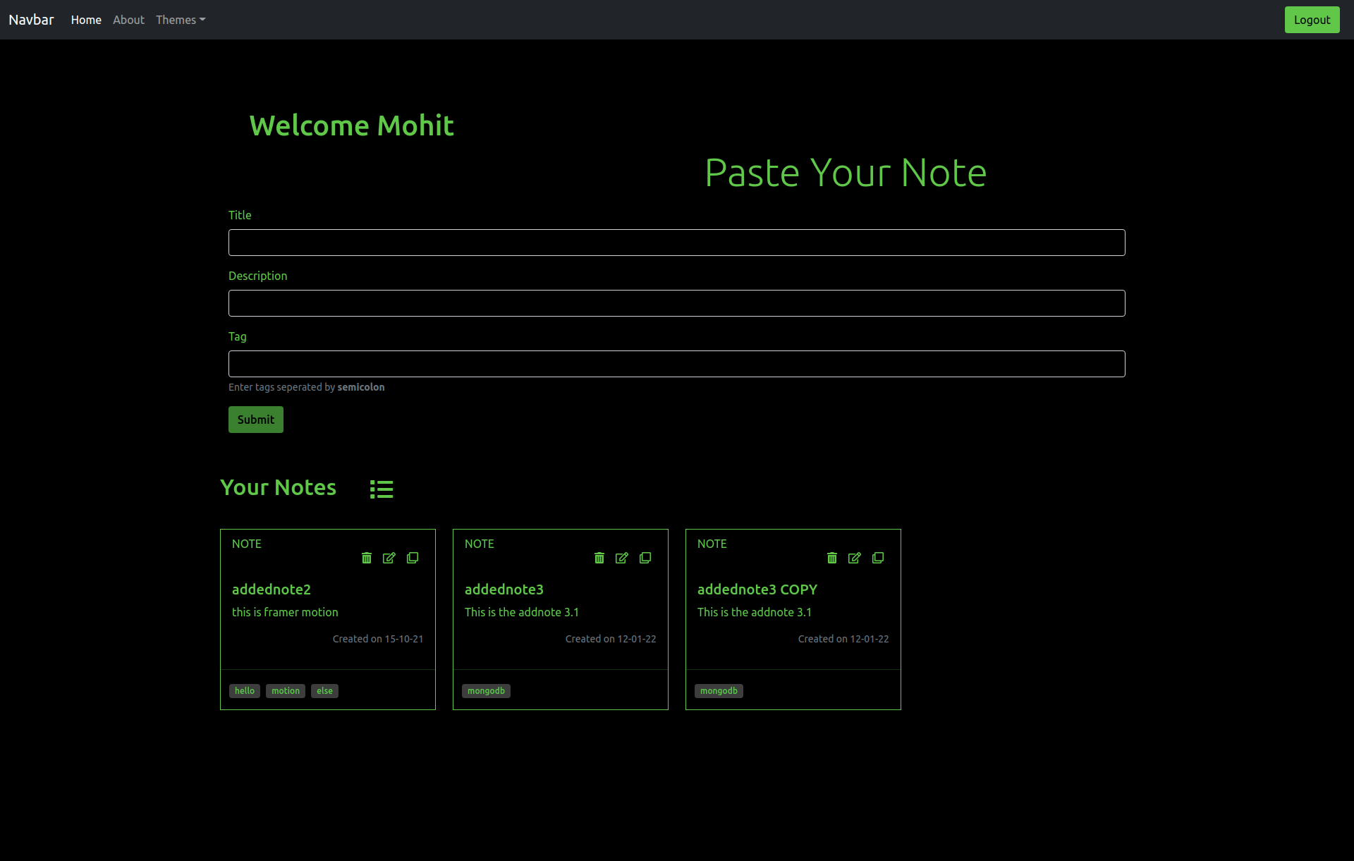 my-notebook is a web application that is used to keep your notes securly. Each user can create, edit and delete its own notes. It also authenticates the user before performing any CRUD operation.