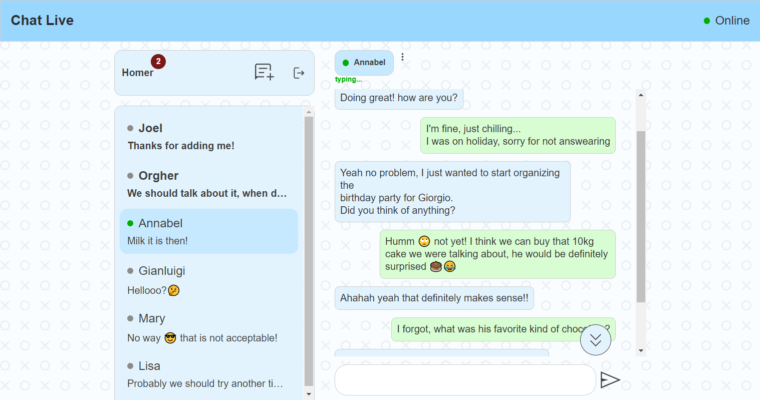 - Request the server to open a socket, that is a Websocket connection. On this socket the user will be able to chat with his/her friends and to monitor the online and typing status of his/her friends.