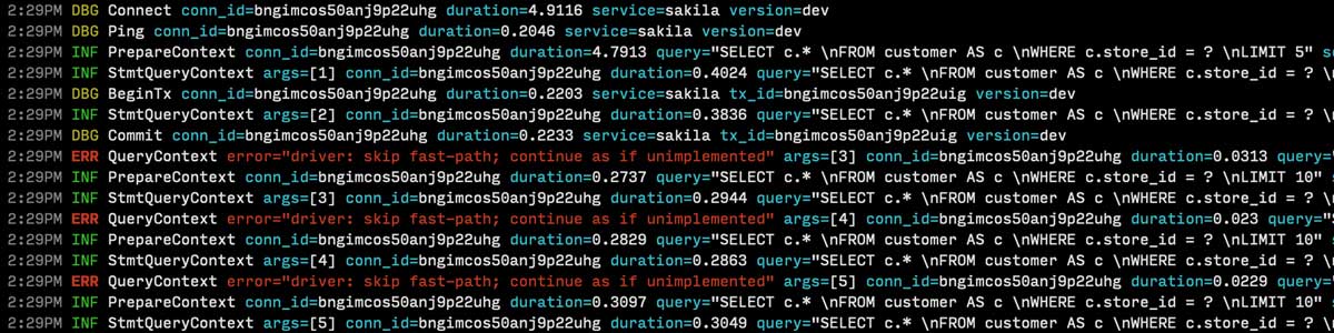 db := sqldblogger.OpenDriver(dsn, &mysql.MySQLDriver{}, loggerAdapter /*, ...options */)