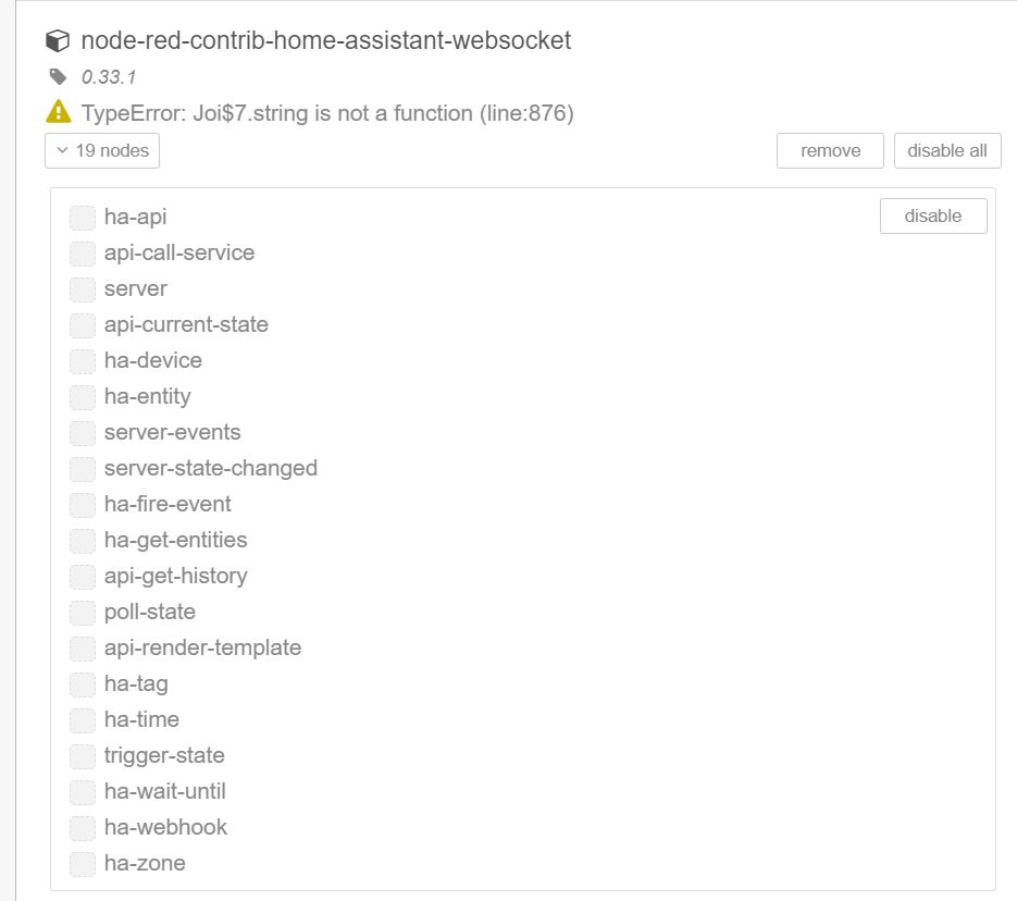 I have node-red in a docker container of a RPBi (installed as per https://nodered.org/docs/getting-started/docker ). I've installed the palette as shown below. The nodes were there on the right side panel so I've inserted a node into the flow a tried to configure my HA server. The node settings went on and off (blinking like every second) so I refreshed the browser tab. After that the nodes disappeared from the side panel and I found this error in the settings. I've tried to reinstall the palette/restart RPi few times but it didn't work.